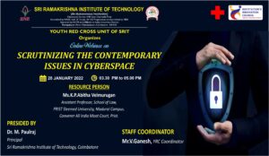 The Youth Red Cross of Sri Ramakrishna Institute of Technology has planned to organize a webinar on Scrutinizing the contemporary issues in Cyberspace  through Google Meet on 28.01.2022.