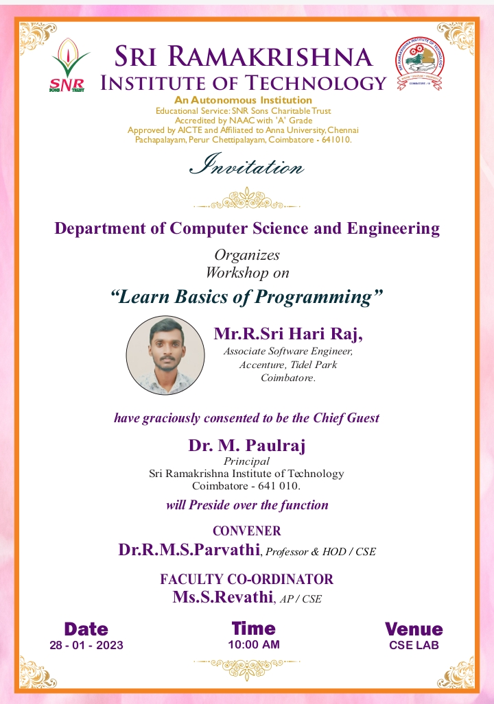 Workshop on “Learn on Basics Programming” Map Unavailable Date/Time Date(s) - 28/01/202310:00 am - 12:00 pm Categories Workshop